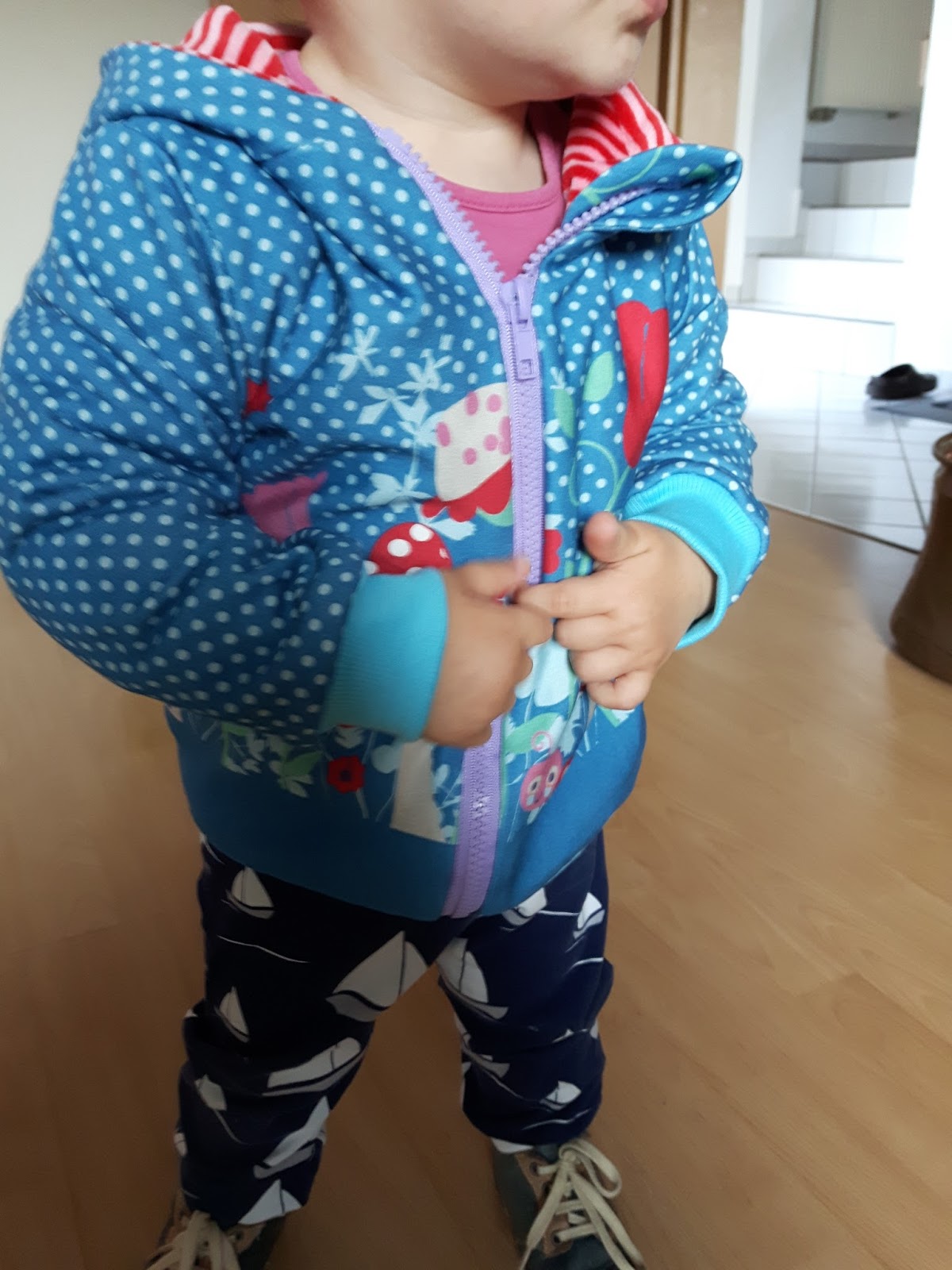 Als erstes habe ich ja die Lieblingsjackerl von Fred von Soho genäht. Wie schon erwähnt, hat sie mich ein wenig "Nerven" gekostet, da die Jacke eigentlich nicht zum füttern gedacht war. Aber ich wollte sie ja unbedingt haben, und ja auch mit Reißverschluss. Ich finde das Ergebnis kann sich sehen lassen, ich bin sehr zufrieden. Ich habe das Bündchen etwas verlängert, so ist auch der Poppes schön warm. Hier nochmal ein paar Bilder dazu: